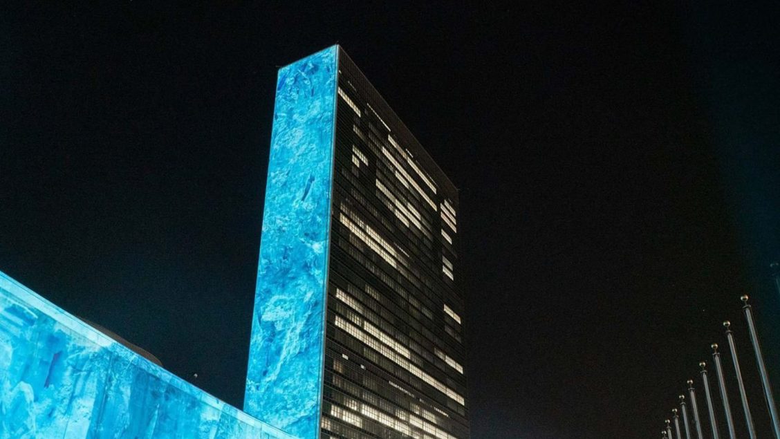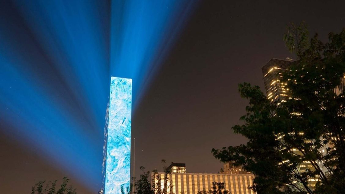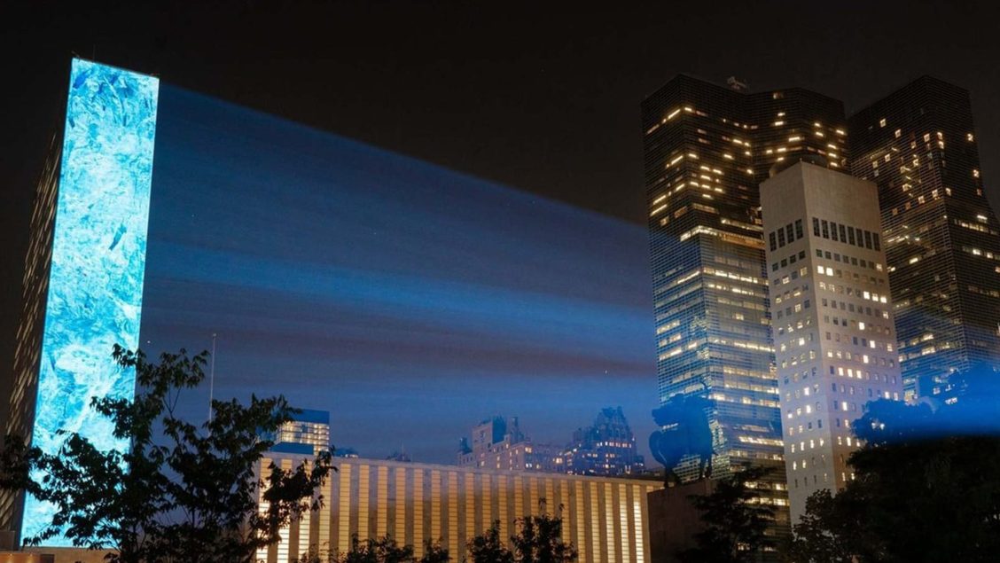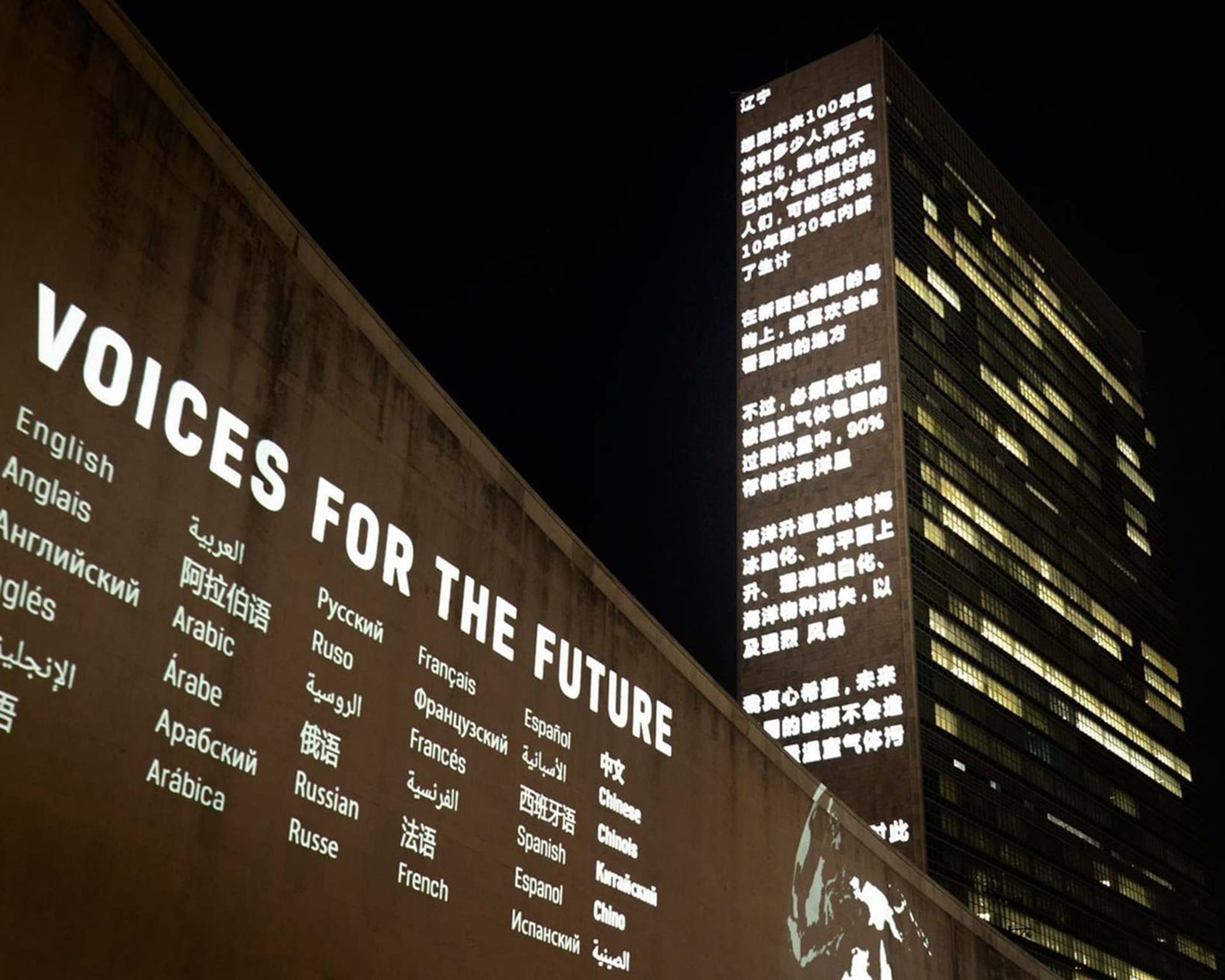 This massive projection system features powerful visuals of an iceberg slowly crashing down the sides of the building, intended to bring the remoteness of Antarctica to urban New York. Messages from young climate change supporters line the building in several different languages, bringing together the feeling of unity across the globe. And what better place to express unity, than on the United Nations Headquarters.