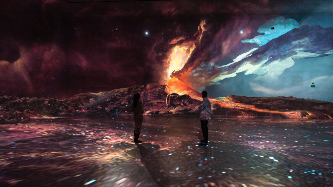 This is the largest gallery at Frameless where visitors are thrown into crashing oceans, explore bustling cities and stand on the edge of fiery volcanoes. The gallery uses wall, floor and ceiling projection, enabling images to be seen across all surfaces to extend every canvas. To conceal the equipment, the projectors have been mounted within the room’s walls using different ranges of lenses.